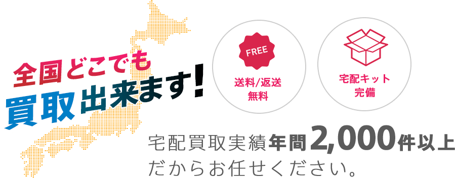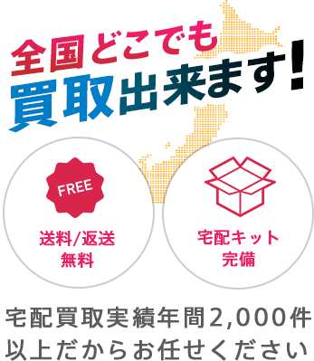宅配買取のみになります。送料は着払いで弊社が負担します。